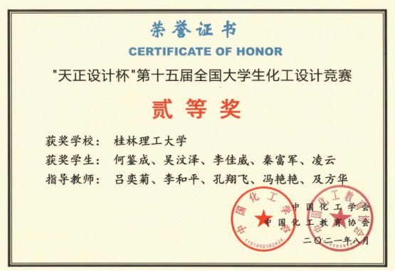 组织化学工程与工艺专业2018级26支队伍参赛,由李和平、吕奕菊、王晓娟、黎燕、王桂霞、姚金环、杨文、冯艳艳、刘峥、及方华等老师组成的团队进行指导。2018级卓越班本科生何鉴成、吴汶泽、李佳威、秦富军、凌云组成的代表队设计的作品“南京扬子石化有限公司年产8万吨异丙醇” 经过师生共同努力,以其出色的设计作品和精彩的线上现场答辩脱颖而出,勇夺赛区一等奖,荣获全国总决赛二等奖。同时,我校还获得全国二等奖1项、三等奖5项、华南赛区三等奖7项,在获奖比例与数量上均为历届参赛最好成绩。获奖情况如下: