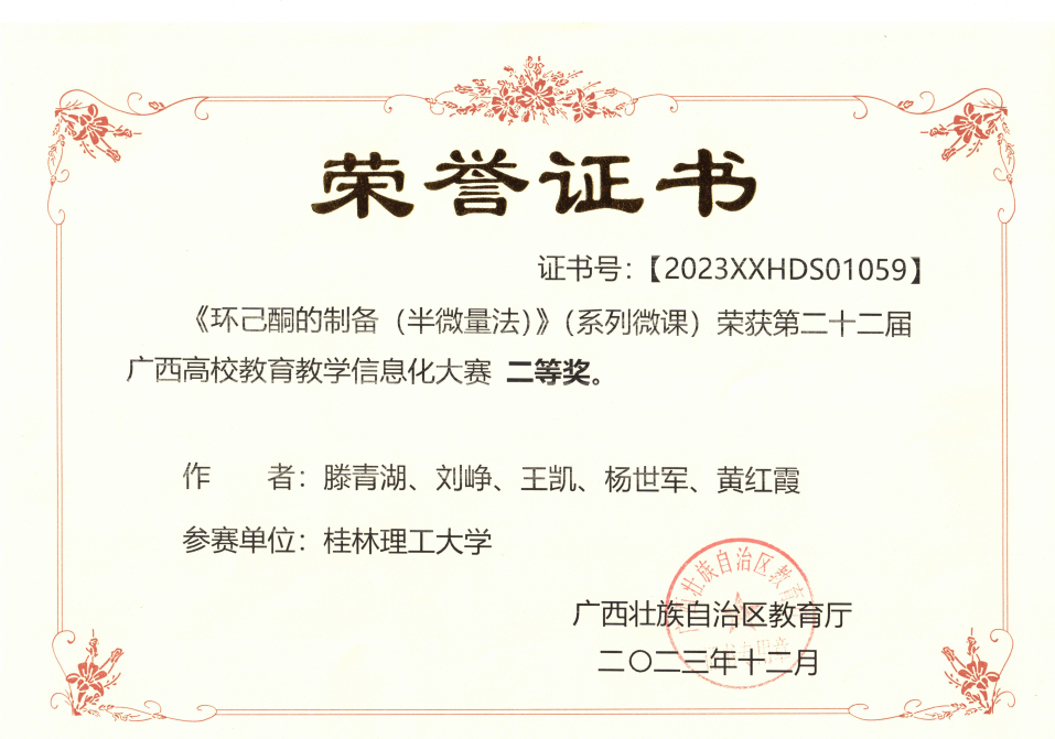 滕青湖老师的参赛作品为:环己酮的制备(半微量法)系列微课。滕老师从教学内容、教学组织、教学方法、语言教态、多媒体制作和视频录制等方面做了精心准备。从环己酮和手机的关系出发,充分激发学生的学习兴趣。课程内容中增加屠呦呦、余国琮等科学家的事迹,培养学生的专业自信。滕老师在系列微课中的授课过程思路清晰,重难点突出。在刘峥老师的悉心指导下,滕老师的系列微课在网评和现场决赛中荣获大赛的二等奖的优异成绩。