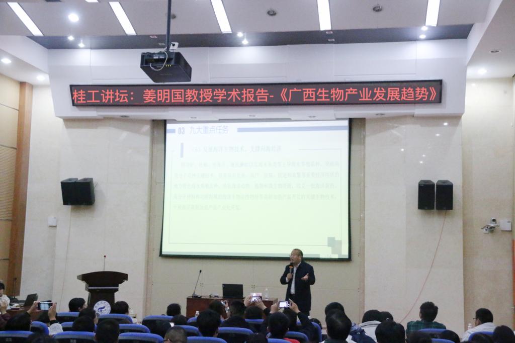 11月19日下午,广西本科高校生物科学与生物工程类教学指导委员会副主任委员姜明国教授应邀在雁山校区12号楼负一楼学术报告厅作了题为“广西生物产业发展趋势”的学术报告。黑白直播官网