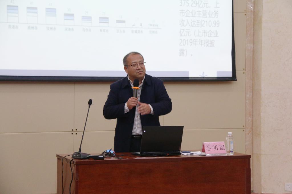 报告会上,姜明国教授首先介绍了广西生物产业的发展现状和发展目标,他还结合国家政策和广西的地理环境优势,提出了广西生物产业发展的九大重点任务、建设两个支撑平台和建立五项保障措施等。姜明国教授认为,要加强交流与合作,未来的生物产业将是“IT+BT”的融合驱动行业,并为广西的生物产业发展描绘了一幅宏伟蓝图。此外,姜明国教授结合广西民族大学海洋与生物技术学院的发展历程,讲解了地方院校应如何在地方产业的大框架下寻找契机,大力发展生物科技的产业化,培养复合型人才、提升服务地方发展的能力等。