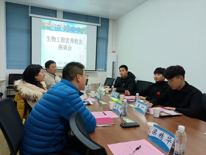 在雁山校区萃华楼12115会议室召开了生物工程专业优秀校友座谈会。学院副院长李霞、教研室主任李静、学工组组长黄道坤以及团委书记张萌萌等老师参加相关活动。