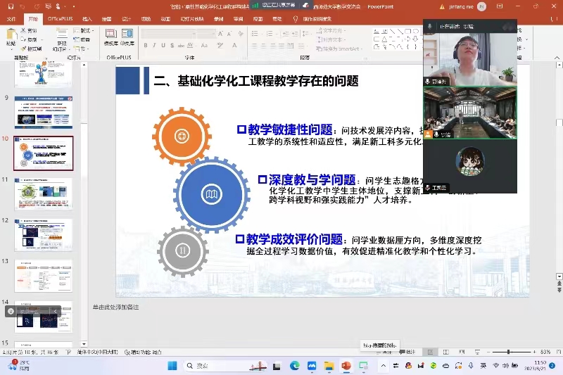 会上,聂瑾芳教授从基础化学化工课程教学存在的问题、基础化学化工课程教学改革路径以及基础化学化工课程群知识图谱构建等几个方面展开了详细讲解,并与参会教师围绕基础化学化工课程群建设过程中遇到的难点痛点、主要解决的教学问题以及解决方法进行了深入探讨和交流,加深了参会老师们对基础化学化工课程建设的认知、拓展了教育教学改革的思路。