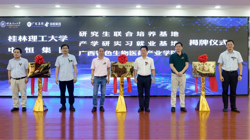 仪式上,中恒集团常务副总经理钟敏代表集团对桂林理工大学的到访表示热烈欢迎,并对双方开展的深度合作表示由衷期待。他表示,中恒集团与学校合作的初心不变,希望与学校在人才培养、产学研融合、实习就业等方面进行深度合作。随后,集团代表与学校代表共同上台,为研究生联合培养基地、产学研实习就业基地、广西特色生物医药产业学院揭牌。揭牌仪式后,方亮院长为企业导师颁发中恒集团研究生导师聘书。