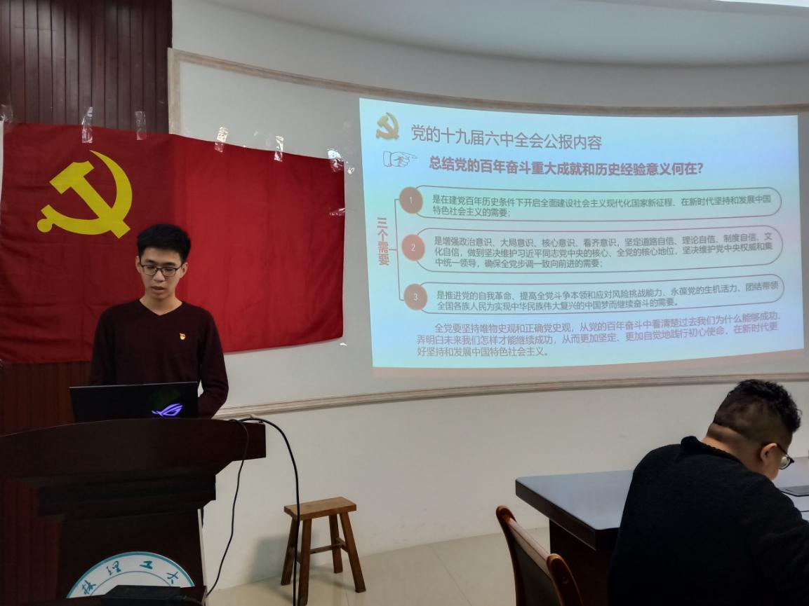 本科生第一党支部在萃华楼12217会议室开展“深入学习贯彻党的十九届六中全会精神”主题党课。全体党员参加本次党课,党课由李学来老师主持。