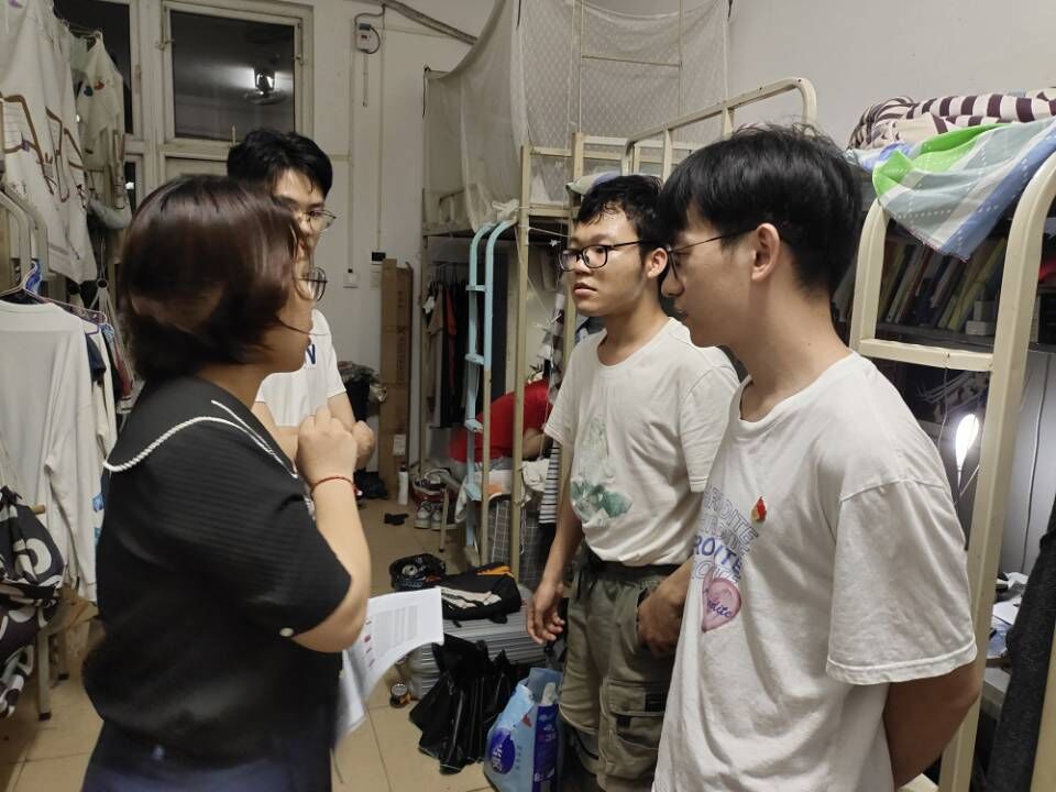 每晚检查宿舍前,各位毕业生党员便充分发挥党员先锋模范作用,展现出自身良好的精神风貌。自发地提早到达集合点,积极寻找对接队伍,团聚一起认真检查宿舍,真正做到了在站好最后一班岗的过程中,担一份责,尽一份力。走检查中,各位毕业生党员们争做先锋,以饱满的热情投入工作。悉心问候生活状态、全面了解学习情况、充分解答各种疑问,同时认真检查宿舍楼顶等地方,检查是否有酗酒、情绪反常同学,以此保证所有毕业生顺利离校。