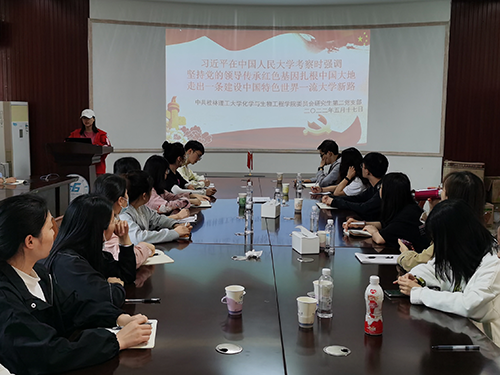研究生第二党支部召集全体在校党员和积极分子在12217会议室开展“坚持党的领导传承红色基因扎根中国大地,走出一条建设中国特色世界一流大学新路”专题学习会,认真学习习近平总书记在中国人民大学考察调研的重要讲话精神。