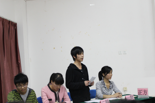 4月15日晚7点,以“大学生是否应该上晚自习”为辩题的趣味辩论赛在雁山校区05314教室举行。学院饶筠筠老师、杨建辉老师、何宗辉老师以及09级优秀学生代表秦冬霞同学与12级全体同学一起观看了本次辩论赛。