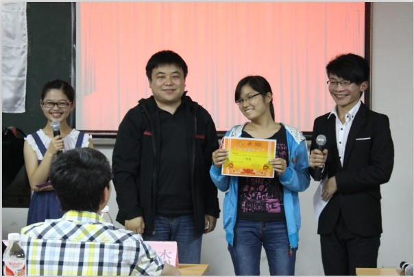 大会第二部分为资助政策宣传活动月颁奖典礼。首先,“化爱为生”公益协会会长黎姗姗同学用PPT带领大家回顾了资助政策宣传月所开展的各项活动,并为获奖选手颁奖。杨建辉老师做总结发言,他肯定了各班级、各协会成员在活动中的努力和付出,他希望同学们能够不忘国家,学校,父母的恩情,励志自强,为实现“中国梦”而努力奋斗。