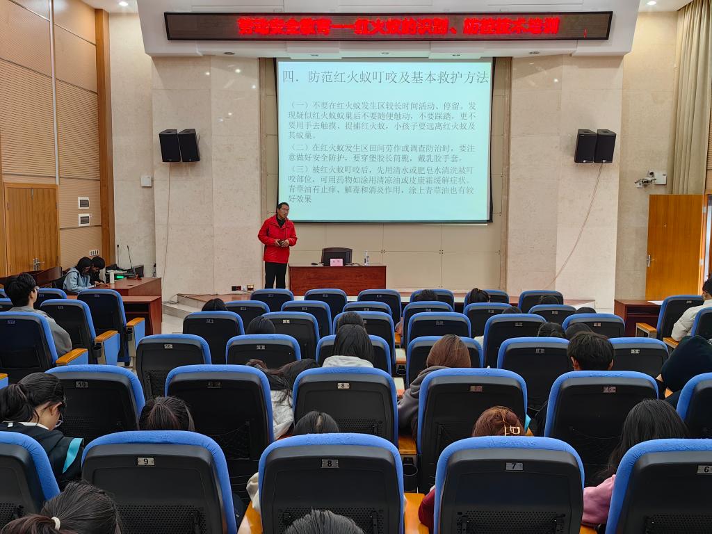 讲座中,袁辉结合大量的实际案例,向与会师生详细讲解了红火蚁的发生特点及危害、红火蚁的识别与防控、防范红火蚁叮咬及基本救护方法等内容。他表示,红火蚁在我国南方有适应性强、竞争力强和繁殖能力强的特点,严重影响了社会生活和人类健康。他希望同学们在参加户外劳动实践过程中,要穿塑胶长筒靴,戴乳胶手套,时刻注意做好安全防护。同时,袁辉还为同学们介绍了被红火蚁叮咬后的基本救护小常识,让师生们受益匪浅。