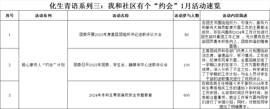 导航痕迹 当前位置: 主页 >> 学生工作 >> 学生活动 >> 正文 【化生青语】化生青语系列三:我和社区有个“约会”1月活动速览 作者: 发布日期:2024-01-18 浏览次数: 为扎实推进学校“一站式”学生社区综合管理模式建设试点工作和黑白直播 “三全育人”综合改革工作,提升学院“一站式”学生社区影响力,黑白直播 将“一站式”学生社区以“党建+X”模式为基础,结合学院【化生青语】育人文化,将学院育人体系下沉社区,打造【化生青语】系列三——我和社区有个“约会”特色活动。1月份,结合学院社区团队,按照学院社区我和社区有个“约会”特色品牌活动,主要开展贴心服务人“约会”计划,同助力学院学子发展。按照“约会计划”,学院举办活动如下。 (一审:张伟颀 二审:黄道坤 三审:李少华) 上一条:学院开展2024年春季学期“开学第一课”专题教育 下一条:学院开展2024年本科生寒假离校安全专题教育