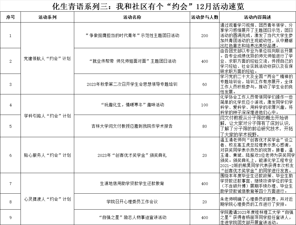 将“一站式”学生社区以“党建+X”模式为基础,结合学院【化生青语】育人文化,将学院育人体系下沉社区,打造【化生青语】系列三——我和社区有个“约会”特色活动。12月份,结合学院社区团队,按照学院社区我和社区有个“约会”特色品牌活动,党建领航人“约会”计划、学科引路人“约会”计划、贴心服务人“约会”计划、心灵摆渡人“约会”计划四个系列活动同步推进,共同助力学院学子学习、生活、就业等方面的发展。按照“约会计划”,学院举办活动如下。