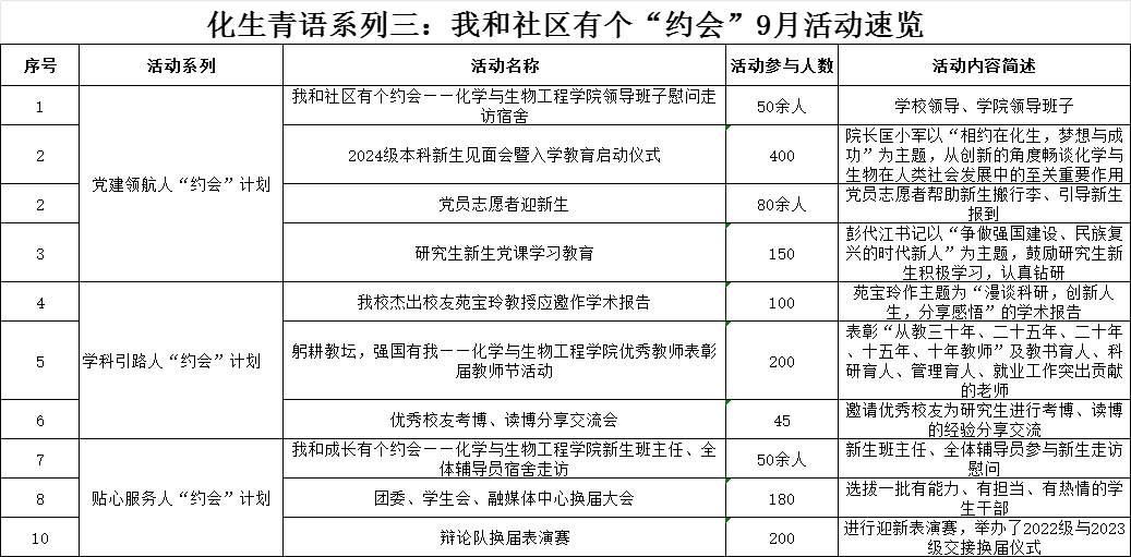 将“一站式”学生社区以“党建+X”模式为基础,结合学院【化生青语】育人文化,将学院育人体系下沉社区,打造【化生青语】系列三——我和社区有个“约会”特色活动。9月份,结合学院社区团队,按照学院社区我和社区有个“约会”特色品牌活动,党建领航人“约会”计划、学科引路人“约会”计划、贴心服务人“约会”计划三个系列活动同步推进,共同助力学院学子学习、生活、就业等方面的发展。按照“约会计划”,学院举办活动如下。