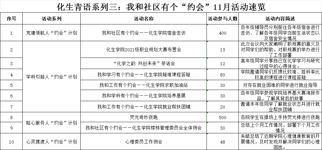 将“一站式”学生社区以“党建+X”模式为基础,结合学院【化生青语】育人文化,将学院育人体系下沉社区,打造【化生青语】系列三——我和社区有个“约会”特色活动。11月份,结合学院社区团队,按照学院社区我和社区有个“约会”特色品牌活动,党建领航人“约会”计划、学科引路人“约会”计划、贴心服务人“约会”计划、心灵摆渡人“约会”计划四个系列活动同步推进,共同助力学院学子学习、生活、就业等方面的发展。按照“约会计划”,学院举办活动如下。