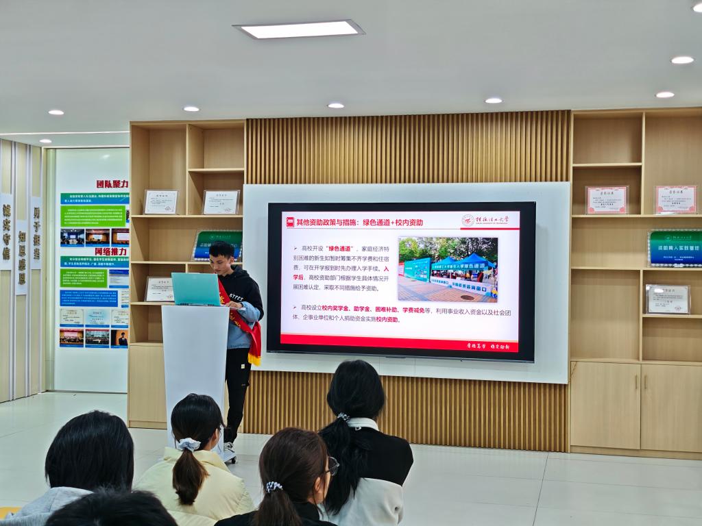 活动伊始,学校学生资助宣传大使陆鹏飞对学校资助育人实践基地的功能和作用进行了全面介绍,为同学们搭建了一个全面了解资助政策的平台。随后,何灿丽、韦砚俊、杨兰雨等3位同学对国家和学校的各项资助政策进行了深入解读,内容涵盖奖学金、助学金、国家助学贷款、勤工助学、参军入伍及基层就业学费补偿贷款代偿、学费减免等多种形式的内容,为大家答疑解惑。