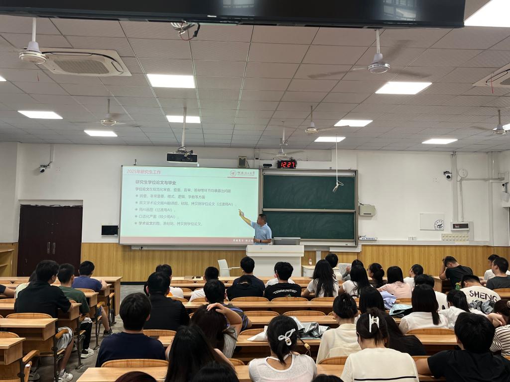 大会伊始,孔翔飞结合近三年研究生就业情况及读博情况作了就业形势分析,鼓励同学们积极了解就业形势,认真制作简历,珍惜就业机会。随后,他结合往年部分高校毕业生求职就业安全案例,为同学们讲解了安全注意事项,提醒毕业生们在找工作时切不可掉以轻心忽视安全问题。最后,为确保同学们明确毕业注意事项,孔翔飞为同学们详细解读了《桂林理工大学研究生学位授予工作实施细则》,向同学们特别强调了毕业申请条件及学位申请条件细则,提醒毕业生们务必多与导师沟通交流,认真完成毕业论文,为顺利毕业做好准备。