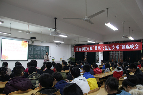 在励新楼206室举行寻找“最美化生团支书”活动颁奖晚会暨五四红旗团支部建设经验交流会,本次晚会是对过去两个月化生学院打造特色团支部活动的总结。出席本次活动的嘉宾有学院党委副书记陶剑飞、学院团委学生会主席团成员及各班班长、团支书。