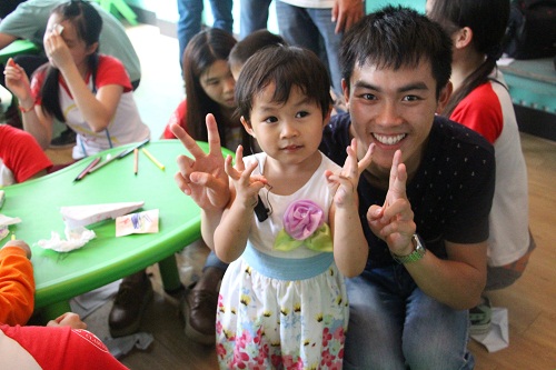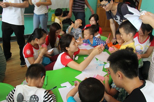 中午12:30分,志愿者们按原定计划在一号食堂前面集中,出发前往桂林市圆林聋儿康复中心。连日来的暴雨,让我们的活动组织者们对安全工作不敢有丝毫的懈怠。经过两个小时的车程,同学们来到了聋儿康复中心。按照原定计划开展相关工作,教孩子们折纸、唱歌、画画、说话。最初,面对陌生的哥哥姐姐们,孩子们都还认生,经过志愿者们的耐心沟通过后,大家都很积极很活跃了。拉着哥哥姐姐们要学这学那。虽然孩子们大多数不能够正常说话,但这却也无法阻断志愿者们与孩子们之间的交流。