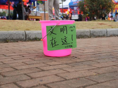 在大本营处和道路拐角处放置了“爱心垃圾桶”,并贴上了“文明在这里”的温馨标语。随手将垃圾扔入垃圾桶看似是一件小事,却是一个人文明素养的体现。
