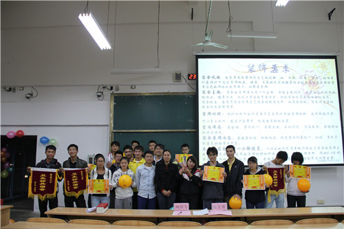 体质最强班系列活动的重点活动项目之一,经过活动精心策划,组织开展,班级激烈比拼,最终决出了本次竞赛的获胜班级,并于2014年11月8日晚在励新楼207室举办班级气排球大比拼竞赛颁奖晚会。学院党委副书记陶剑飞、2013级辅导员陈文甫,各班级气排球球队代表,2013、2014级各宿舍代表参加了本次颁奖晚会。
