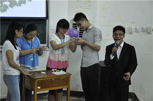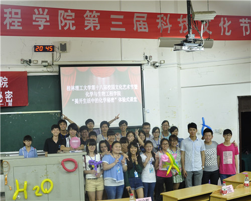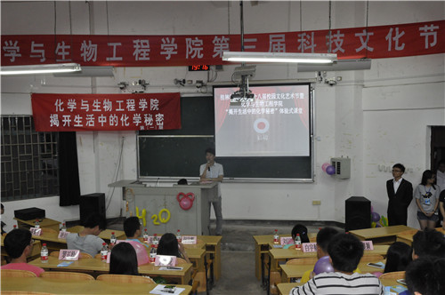 导航痕迹 当前位置: 主页 >> 学生工作 >> 共青团 >> 正文 科技畅想青春未来 文化彰显化生风采――――化生学院成功举办“揭开生活中的化学秘密”体验式课堂活动 作者: 发布日期:2015-07-19 浏览次数: 为丰富校园文化生活,提高学校同学对化学学科的兴趣,24日晚7点,化生学院在雁山校区05103教室举办了桂林理工大学第十八届校园文化艺术节之“揭开生活中的化学秘密”体验式课堂活动。学院何宗辉老师、学院研究生会副会长张海峰以及各兄弟学院团委学生会代表作为嘉宾与学院同学一同参加了此次活动。 何宗辉老师首先致开幕词,他说到在理工科院校开展大学生科技活动具有很大的意义,对于提升同学们的专业知识素养起到很好的促进作用,他希望同学们能够以此类活动为契机,体验化学的奥秘,寓学于乐,培养自己对化学学科的钻研精神。接着主办方为大家播放了《进击的化学》宣传片,神秘新奇的化学实验现象,博得在场同学的阵阵惊呼。接下来张海峰同学结合PPT带领大家从生活食品类、生活衣物类等方面走进化学,揭开生活中的化学秘密,使大家对生活中的化学有了一个全新的认识。在课堂讲解后进行了实验展示环节,实验操作人员先后为大家展示了电池生火、可乐喷泉等现场实验,最后是观众互动环节,同学们积极踊跃参与答题,把现场气氛推向了最高点。 此次活动以生活中的化学为载体,引导学生去探讨科学,给同学们展示了化学的神奇与美妙,激发了同学们对化学的兴趣,并提高了大家的专业文化素养,为学院的学风建设起到积极的促进作用。 何宗辉老师发言 活动现场 活动现场2 实验展示 合影 上一条:班之魅力,刊动奇迹――化生学院成功举办班刊设计大赛 下一条:化生学院举办“快乐运动,快乐学习”趣味运动会