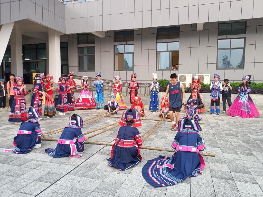 学子为领导嘉宾进行竹竿舞表演,还邀请了路人王球赛队员体验竹竿舞,现场气氛热烈。