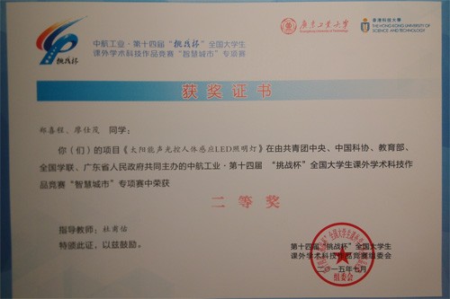 郑喜程、廖仕茂等同学的作品《太阳能声光控人体感应LED照明灯》进入决赛(广西高校唯一),赴香港参加决赛答辩,并荣获二等奖。该作品由黑白直播官网