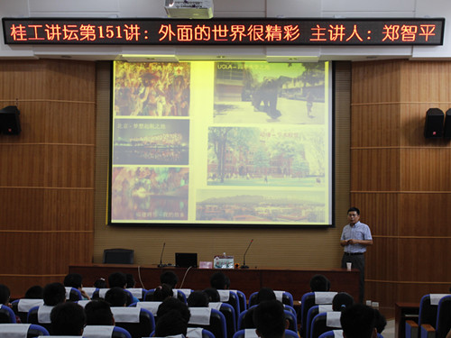 讲座伊始,郑智平教授就提出了“人生在世,心灵和身体必须有一个在路上,精彩的走一遭”的倡议。随后他用幽默的语言、结合优美的图片,给我们介绍了美国、智利以及一些国外的高等学府的基本情况,向我们展示了外面世界的风光以及文化,赢得同学们阵阵掌声。随后,他结合自己的学习历程以及多年海外留学的经验,鼓励大家在大学里努力学习、学会交往、学会独立、学会担当,成为一个对社会有用的人。最后,郑智平教授还解答了同学们在学习、生活以及专业上遇到的问题