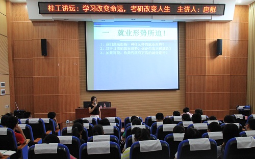 唐群博士受邀在雁山校区12报告厅做了题为“学习改变命运,考研改变人生”的专题讲座。学院2012级、2013级、2014级同学参加了本次讲座。
