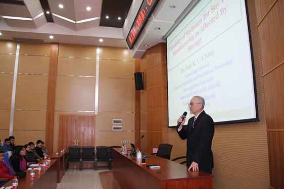 报告会上,Chang教授对美国主要农作物作了简单的介绍,详细阐述了大豆食品的重要性及其加工处理过程,并重点介绍了大豆食品的加工工艺流程,如豆奶、豆腐、腐竹等。同时, Chang教授以图文并茂的形式生动地给在场师生展示了大豆加工的生产设备、豆腐在电子显微镜下的结构以及大豆蛋白质在加工中的凝胶过程。最后, Chang教授鼓励大家多学习和了解有关大豆食品加工处理的知识。
