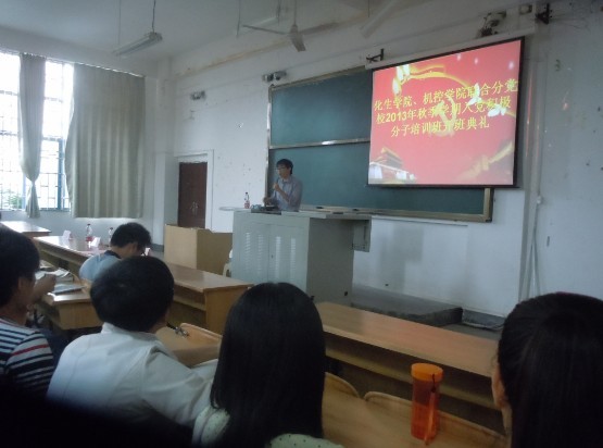 10月24号,化生学院与机控学院联合分党校2013年秋季学期入党积极分子培训班开班典礼在06105举行。机控学院党委副书记邓洁琼老师,化生学院12级辅导员何宗辉老师以及两个学院共186名学员参加了本次开班典礼。开班典礼由机控学院12级辅导员刘金良老师主持。
