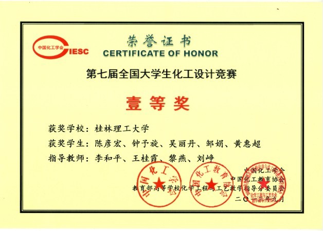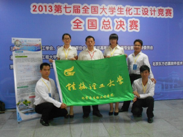 2013年全国大学生化工设计竞赛吸引了包括天津大学、清华大学、华东理工大学、浙江大学、四川大学、华南理工大学、南京工业大学、中南大学、大连理工大学、厦门大学、桂林理工大学等来自全国164所高校的1100余支队伍报名参赛,比赛竞争非常激烈。大学生化工设计大赛目前已发展成为是国内化工行业规模最大,水平最高的本科生赛事。 大赛通过对化工企业工程项目的整体设计,对学生的化工知识综合运用能力、化工设计软件的应用能力和创新意识进行全方位考查,旨在从多方面培养大学生的现代工程设计、团队协作、工程实践和创新能力,成为充分展示高校科研、教学能力和综合设计实力的平台。我院组织化学工程与工艺专业2010级17支队伍参加了第七届全国大学生化工设计竞赛,取得参赛历史的最好成绩,共获得全国总决赛一等奖1项(华南赛区决赛特等奖)、二等奖1项(华南赛区决赛一等奖)、三等奖4项(华南赛区决赛二等奖)。获奖名单与成绩如下:
