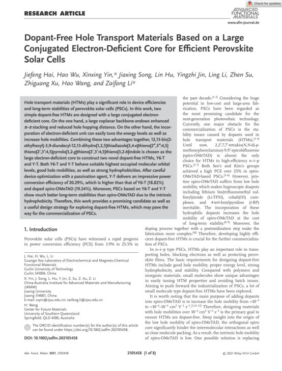 海杰峰副教授与嘉兴学院中澳先进材料与制造研究院尹新星博士课题组在免掺杂空穴传输材料修饰的钙钛矿太阳能电池方面取得重要研究进展。9月21日,该研究成果以“Dopant-Free Hole Transport Materials Based on a Large Conjugated Electron-Deficient Core for Efficient Perovskite Solar Cells”为题在《Advanced Functional Materials》(SCI一区TOP期刊,影响因子18.8)上发表。