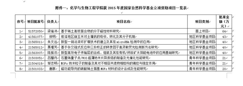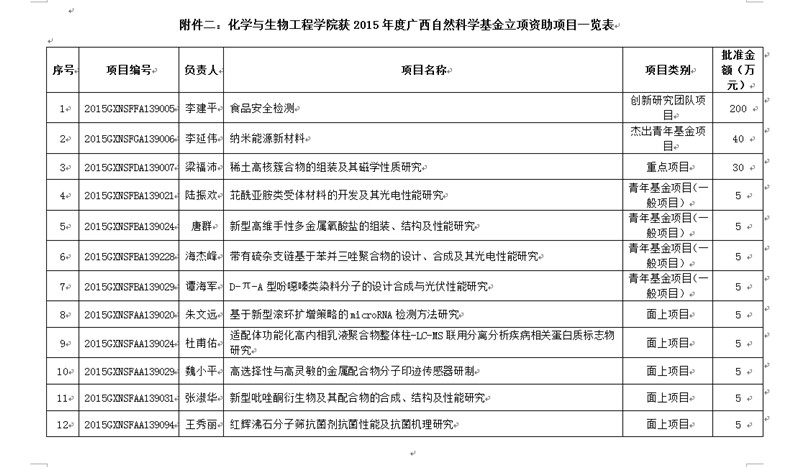 获2015年度广西自然科学基金立项资助项目12项,经费金额共计315万元(详见附件二)。其中创新研究团队项目、杰出青年基金项目为黑白直播官网