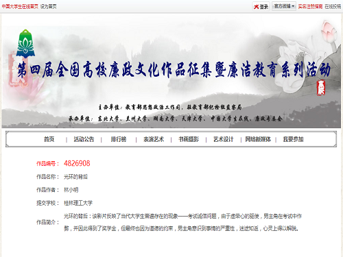 导航痕迹 当前位置: 主页 >> 新闻资讯 >> 黑白直播新闻 >> 正文 黑白直播官网 作品“光环的背后”获第四届全国高校廉政文化作品征集入围奖 作者:陶剑飞 发布日期:2016-01-15 浏览次数: 为在广大学生中深入开展廉政教育,紧紧围绕立德树人根本任务,积极培育和践行社会主义核心价值观,进一步推进高校廉政文化建设和廉洁教育工作,黑白直播官网 积极参加教育部办公厅举办第四届全国高校廉政文化作品征集暨廉洁教育系列活动,选送作品《光环的背后》参赛获新媒体视频类入围奖。 该影片反映了当代大学生普遍存在的现象——考试诚信问题,由于虚荣心的驱使,男主角在考试中作弊,并因此得到了奖学金,但最终也因为道德的约束,男主角意识到事情的严重性,迷途知返,心灵上得以解脱。 图一 图二 入围链接://ulive.univs.cn/event/event/template/list/307/846.shtml 上一条:黑白直播官网 召开期末工作会议 下一条:化工教研室老师组织化学工程与工艺学生参观桂林立白日化有限公司