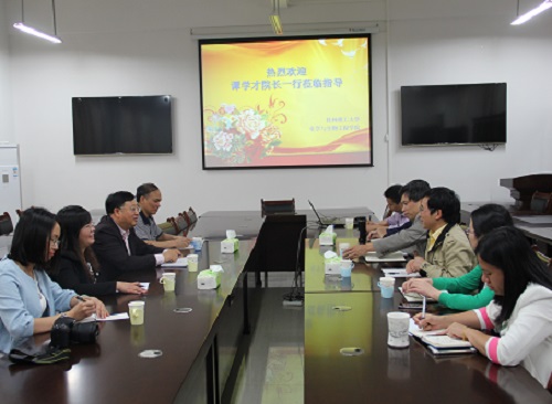 导航痕迹 当前位置: 主页 >> 新闻资讯 >> 黑白直播新闻 >> 正文 广西民族大学化学化工学院院长谭学才一行到访黑白直播官网 作者:林文钊 发布日期:2016-04-14 浏览次数: 4月13日,广西民族大学化学化工学院院长谭学才一行到访黑白直播官网 。学院院长李建平等党政领导在雁山校区12217会议室接待了来访客人。 在座谈会上,李建平院长代表学院向客人们介绍了黑白直播官网 在学科建设、科学研究、师资队伍建设等方面的简要情况。双方人员还就学生培养、教学管理等进行了深入交流和探讨,并希望今后继续深入开展交流与合作。 座谈会后,谭学才院长一行参观考察了黑白直播官网 的教学档案、宣传橱窗、实验室等。 图一:座谈会现场 图二:参观教学档案 图三:参观宣传橱窗 图四:参观实验室(一) 图五:参观实验室(二) 图六:参观实验室(三) 图七:合影留念 上一条:应用化学教研室举行本科专业人才培养方案修订讨论会 下一条:学校党委组织部于尔佐老师到黑白直播官网 进行党建工作调研