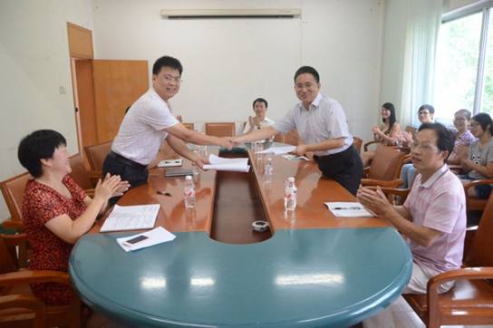 和广西地质矿产测试研究中心签署了共建合作协议,双方还就各自的科研、生产情况和未来的合作发展进行了座谈。黄庆柒书记指出,教学实习实训基地的建立,是新常态下的新发展,顺应了中心“十三五”发展战略的需要,对中心优化人才培养机制,快速有效培训挖掘高校优秀应用型、复合型、创新性实验测试专业技术人才有重大推进作用。