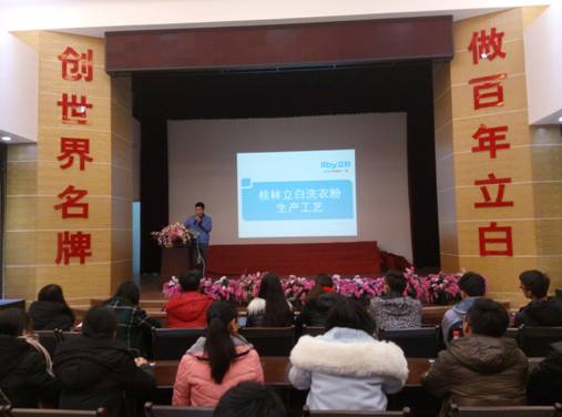 化工专业13级3班、4班和卓越班在刘峥老师、杨世军老师的带领下前往桂林立白日化有限公司进行参观实习。首先立白公司的安全主管为同学们详细介绍了参观所需注意的安全事项。之后通过一段视频介绍立白集团的创建、发展和壮大的历程:在秉承“健康幸福每一家”的理念下,立白集团在改革开放的浪潮中破浪而出,成为中国民族日化的巨无霸航母,引领民族日化走向星辰大海。“立信、立责、立质、立真、立先”的价值观更是深入每一个立白人以及消费者的心中。最后由车间技术主管为学生深入介绍了立白洗衣粉、洗洁精等两大主要产品的生产流程。随后,接待人员带着同学们进入到桂林立白的一线生产厂区。在包装车间中,流水线上是包装整齐的洗衣粉和洗衣液,而不远处工人们则忙碌的给处理好的产品进行分装与装箱。在窗户边,同学们可以看到理论上的生产流程生产出产品。虽然接触时间短暂,但同学们也收获不少!感谢桂林立白日化有限公司给同学提供参观实习的机会!