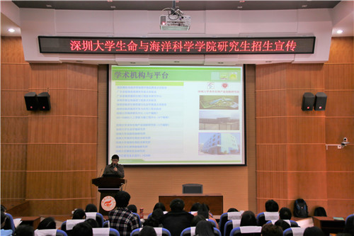 活动开始,首先由王潮岗教授介绍深圳大学生命与海洋科学学院的平台建设,其中包括重点实验室、仪器设备、科研经费、学院硕导师资,庞大的学术队伍等。他还详细地为同学们介绍了生命与海洋科学学院的学科方向、主要研究工作等方面。关于人才培养及就业情况,他表示:学生学术成果多,因此就业前景广阔。紧接着邓旭教授为同学们介绍了研究生招生政策以及学院良好的教育设施、优越的住宿条件等,希望更多的大学生能够找准自己的学习方向,确定人生目标。