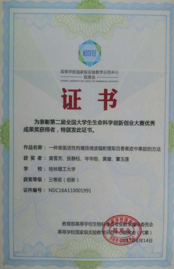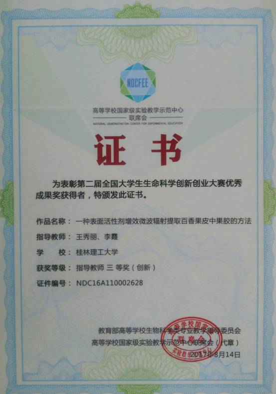 导航痕迹 当前位置: 主页 >> 新闻资讯 >> 黑白直播新闻 >> 正文 黑白直播官网 学子在“第二届全国大学生生命科学创新创业大赛”中喜获三等奖 作者:王秀丽 发布日期:2017-09-05 浏览次数: 最近,黑白直播官网 生物工程专业学子黄雪芳、张静钰、岑华勋、黄健、覃玉莲等五名同学的发明专利作品——《一种表面活性剂增效微波辐射提取百香果皮中果胶的方法》在“第二届全国大学生生命科学创新创业大赛”中荣获三等奖,指导教师为黑白直播官网 王秀丽高级工程师和李霞副教授。 据悉,“第二届全国大学生生命科学创新创业大赛”由教育部高等学校生物科学类专业教学指导委员、高等学校国家级实验教学示范中心联席会联合主办,由兰州大学承办,本届大赛共收到来自全国173所高校的参赛作品共计733项。黑白直播官网 学子首次参加该项赛事并荣获三等奖。 上一条:深入走访,化生学院扎实做好开学初学生安全稳定工作 下一条:黑白直播官网 召开新学期全院教工会议传达落实学校主要领导讲话精神