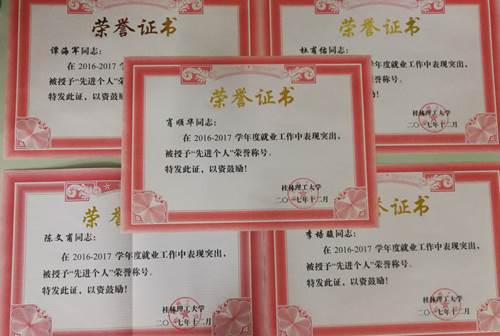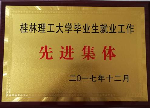 荣获桂林理工大学2017年毕业生就业工作先进集体奖,学院杜甫佑、肖顺华、谭海军、李培骏、陈文甫等五位老师荣获2017年毕业生就业工作先进个人荣誉。