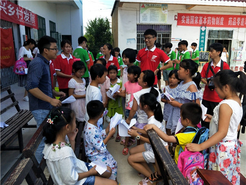 在孩子们都领到新文具之后,实践队员开始把另外一个为孩子们准备已久的惊喜拿了出来,作为化学专业的实践队员们,他们利用自己的专业知识,为孩子们准备了一场属于他们自己的化学实验秀。简单的酸碱指示剂实验、歧化反应,仿佛为充满童真的孩子们打开了化学世界的大门,期待他们以后在元素世界的探索历程。