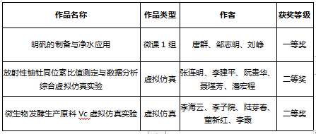 参赛作品《明矾的制备与净水应用》荣获一等奖、《放射性铀钍同位素比值测定与数据分析综合虚拟仿真实验》及《微生物发酵生产原料Vc虚拟仿真实验》荣获二等奖。