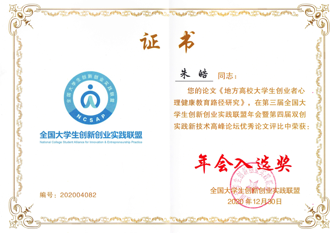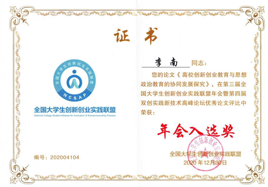 党委副书记、纪委书记李南论文《高校创新创业教育与思想政治教育的协同发展探究》、辅导员朱皓论文《地方高校大学生创业者心理健康教育路径研究》获得“年会入选奖”。