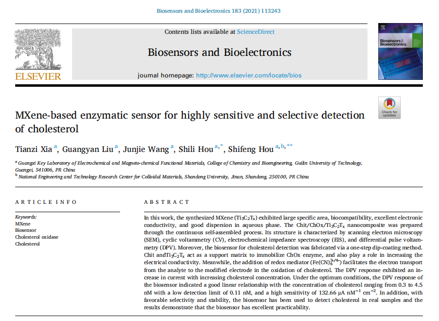 侯士立高级工程师课题组在MXene纳米材料研究领域取得新进展,相关研究成果以MXene-based enzymatic sensor for highly sensitive and selective detection of cholesterol为题在国际知名期刊Biosensors and Bioelectronics(IF=10.257)上发表。该项研究得到广西科技基地和人才专项、桂林理工大学博士启动基金等项目资助。黑白直播官网