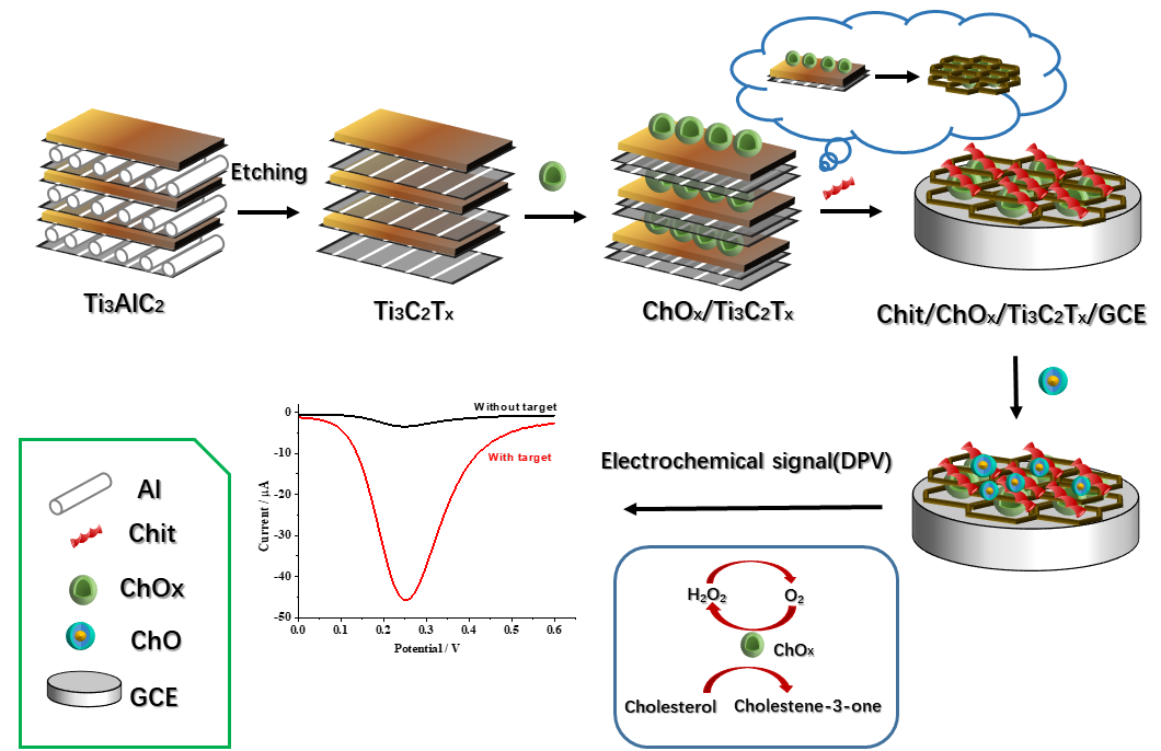 胆固醇含量是许多疾病的重要生物标志物,开发一种简单、精确、灵敏的胆固醇浓度检测方法在学术和医学领域具有重要现实意义。侯士立高级工程师课题组将具有良好导电性的MXene纳米材料与胆固醇氧化酶、壳聚糖结合,成功构建了壳聚糖/胆固醇氧化酶/MXene生物电化学传感器,并应用于人血清胆固醇的检测,该传感器具有良好的稳定性、高的选择性和灵敏度。该研究为高灵敏检测胆固醇含量提供了一种可行思路与解决方案。