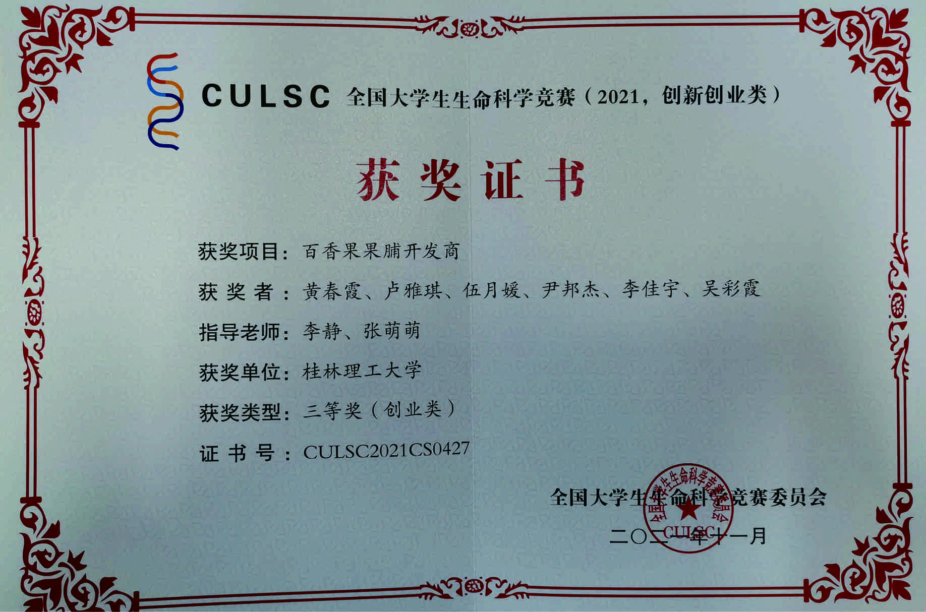 生物工程2018-1班黄春霞等同学在李静和张萌萌老师指导下完成的《百香果果脯开发商》项目获得全国三等奖。应用化学2019-创新班曾悦等同学在潘宏程和刘洁老师指导下完成的《易捷条形码--—抗击基层抗生素滥用》项目获得全国三等奖。