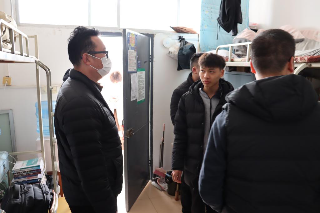 在新学期学生返校之际,为详细了解学生思想生活状态,进一步落实学校疫情防控、线上授课、安全教育等工作。2月28日上午,学院党委副书记李南带领学生工作办公室全体辅导员深入学生宿舍走访学生,与返校学生们深入交流,了解并帮助学生解决相关问题和困难。