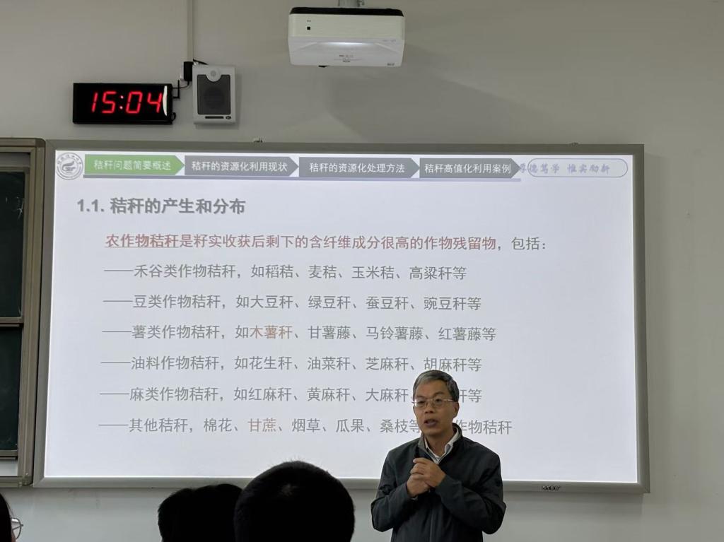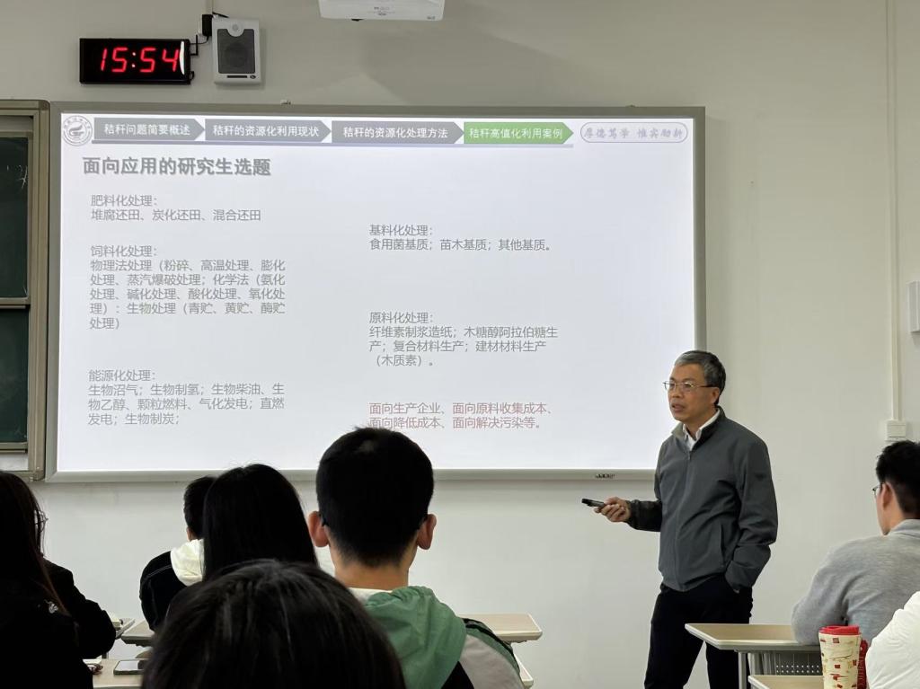 师生讲授了题为《农业秸秆处理 — 绿色发展之路》的生物与医药研究前沿课程。此次讲座内容丰富、深入浅出,不仅为在场的24级研究生提供了前沿的学术指导,也为他们的课题研究选题提供了宝贵的方向与启示。