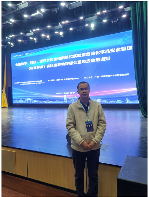 实验室中心主任李子院老师2025年1月17-20日参加由全国危标委(TC251/SC1)主办的2025年第一期“全国教学、科研、医疗及检验检测单位实验室危险化学品安全管理(标准解读)实验废弃物环保处置与应急培训班 ”。该培训班由北京中教华育技术培训中心承办,广西大学国有资产与实验室管理处协办。