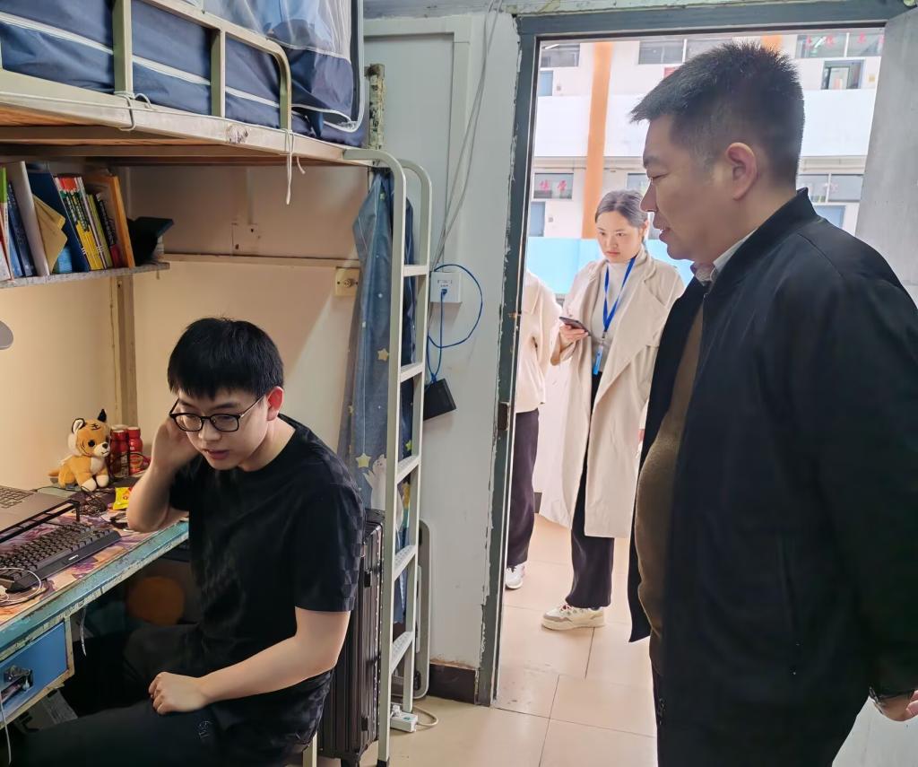彭代江一行仔细查看了宿舍的卫生环境、安全设施等情况,叮嘱同学们要增强安全意识,注意防火防盗防电信诈骗,保持宿舍整洁卫生,春季特别是南风天要预防呼吸道疾病的传播,营造良好的学习和生活环境。他强调,学院始终坚持以学生为中心,努力为同学们创造良好的学习和生活条件,希望同学们能够安心学习,快乐生活,健康成长。随后,彭代江一行还对学院化生苑“一站式”学生社区进行了检查。